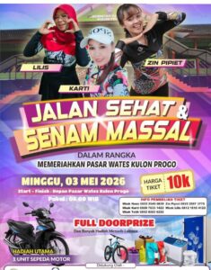 Kulon Progo, 7/4/2026 -karyapost.com,Dalam upaya menghidupkan suasana kawasan perdagangan sekaligus mendorong gaya hidup sehat di tengah masyarakat, akan digelar kegiatan “Jalan Sehat & Senam Massal” yang dipusatkan di Pasar Wates pada hari Minggu tanggal 3 Mei 2026 dari jadwal yang direncanakan pagi sampai selesai dimulai pukul 06.00 Wib dengan rute start hingga finish di depan Pasar Wates.